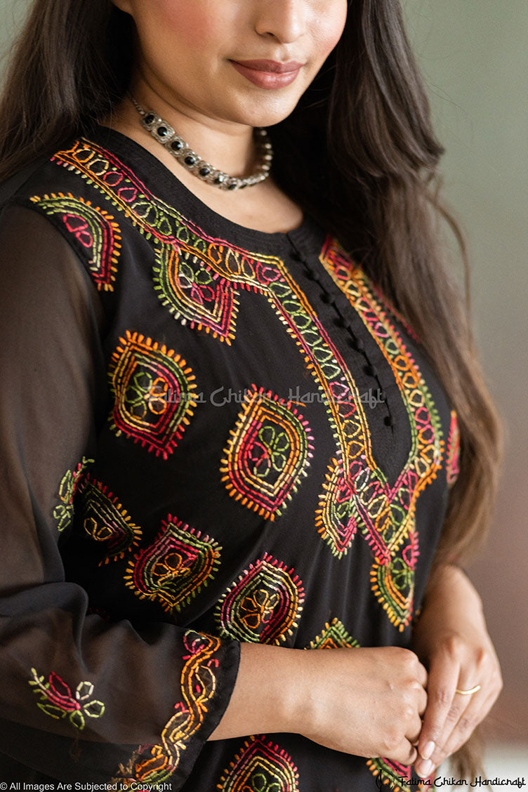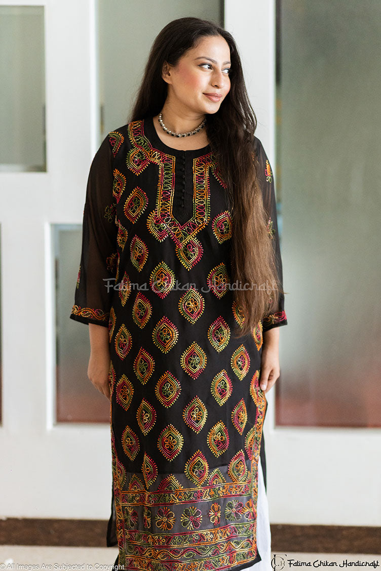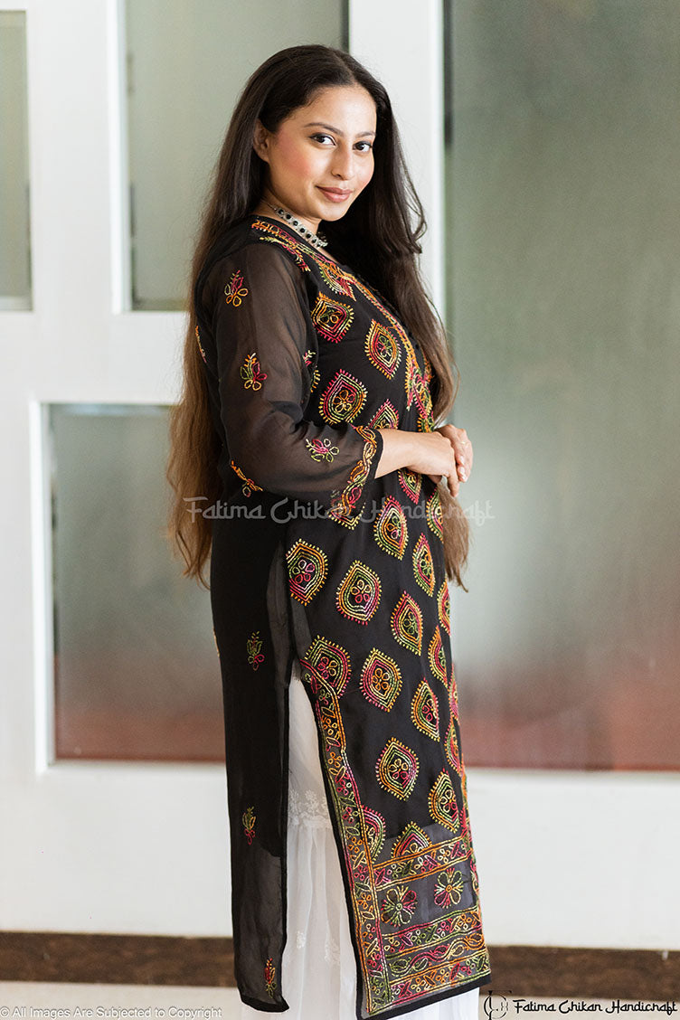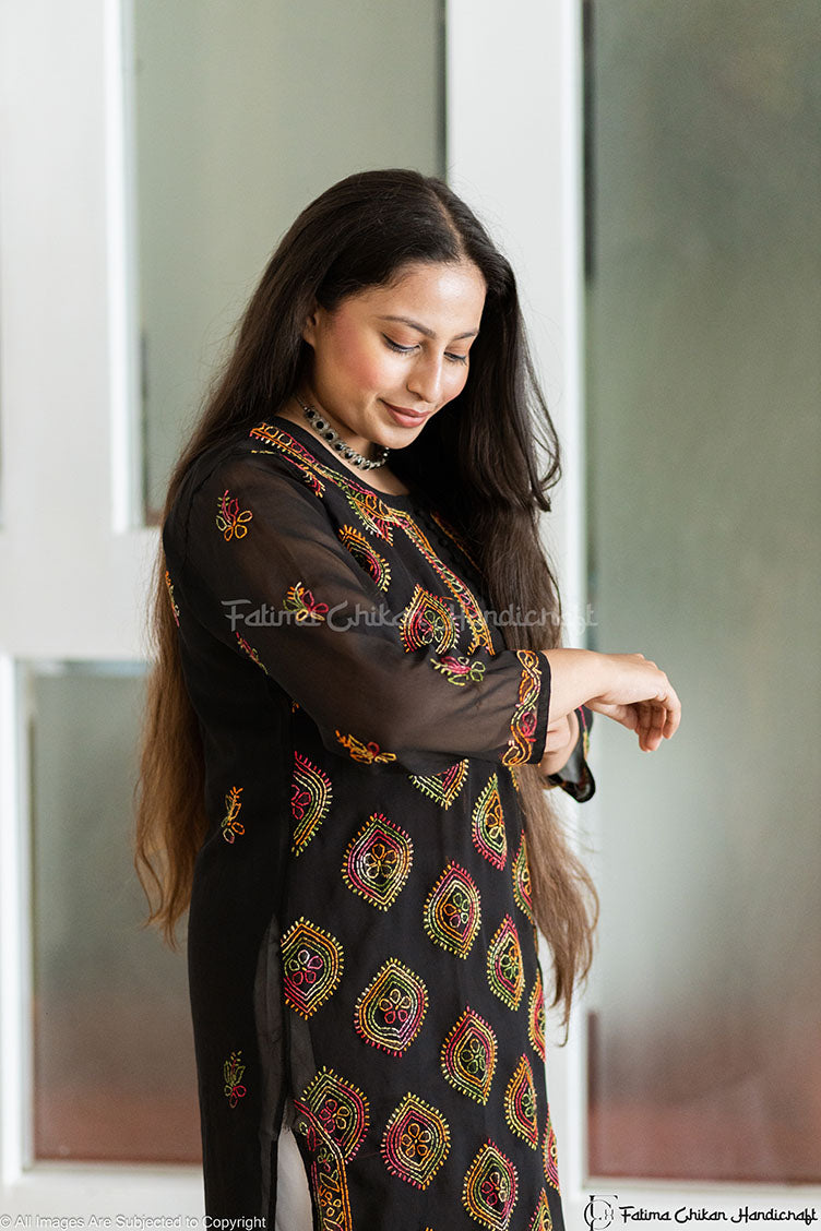 Elevate your style with our exquisite Hafsa Georgette Straight Chikankari Kurti in elegant black multi. Experience the charm of traditional craftsmanship combined with modern design. Shop at FatimaChikanHandicraft for timeless fashion that celebrates your individuality. Explore now!