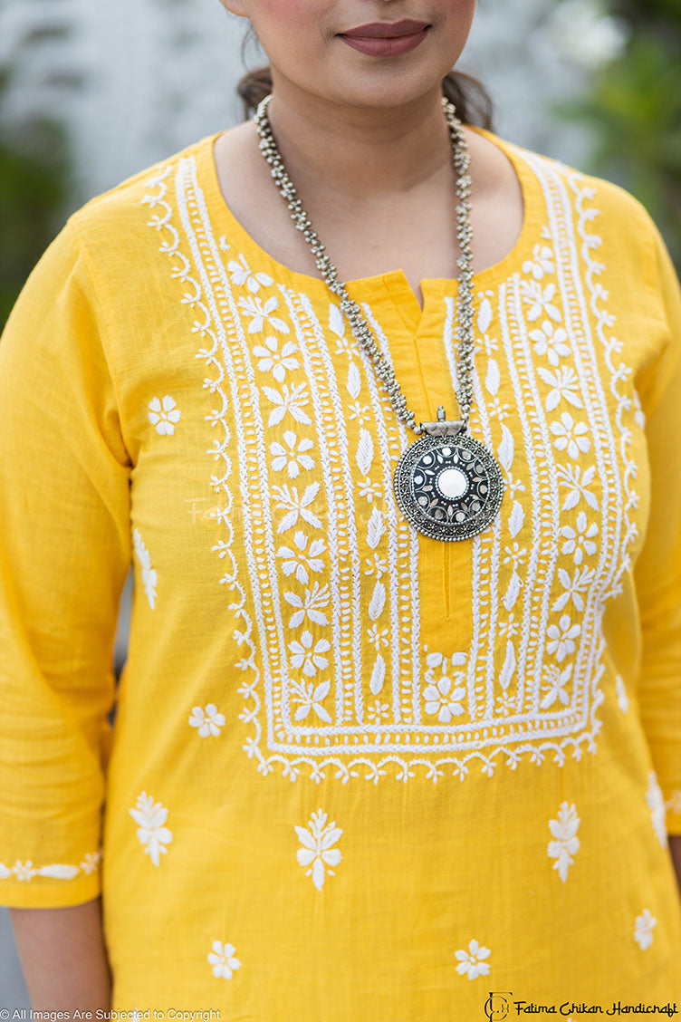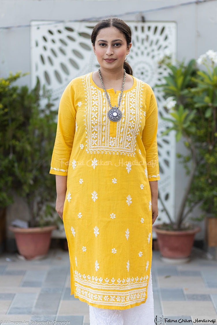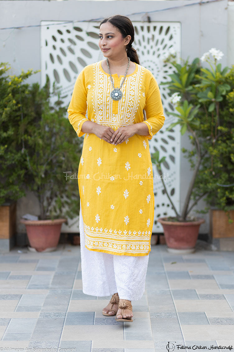 Introducing our exquisite creation, the Khadi Cotton Yellow Yalina Chikankari Straight Kurta, a harmonious blend of tradition and modernity. Crafted with precision in luxurious Khadi Cotton fabric, this masterpiece encapsulates elegance and comfort in every stitch.