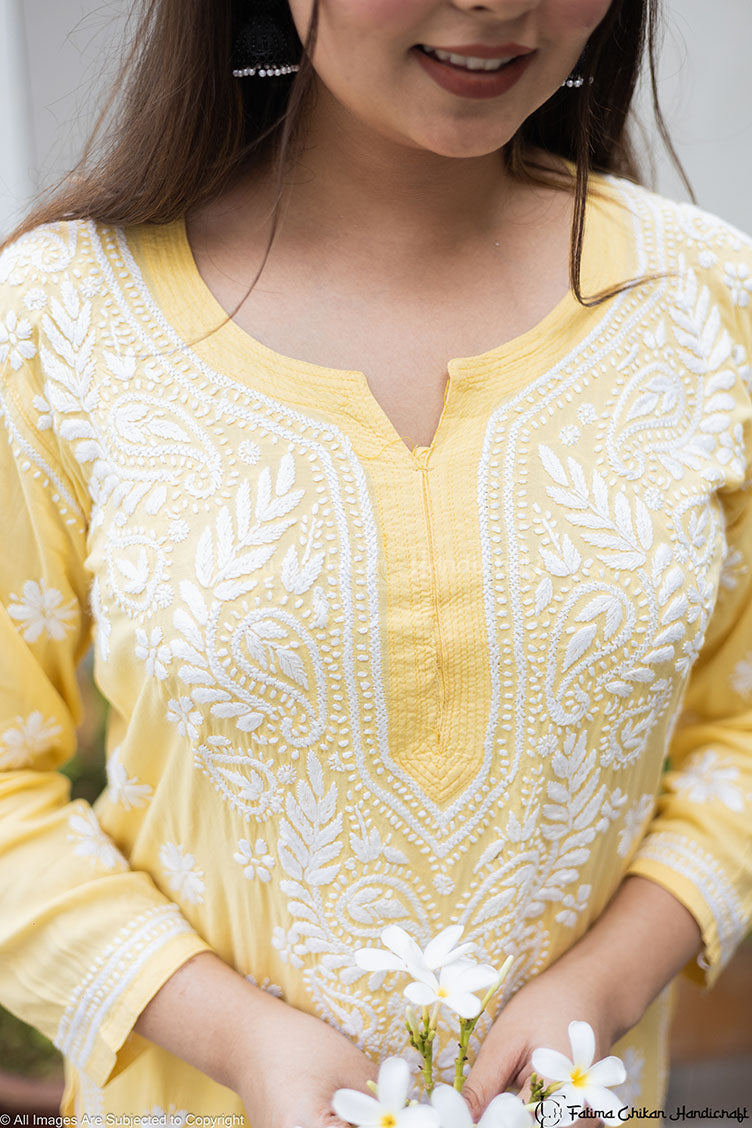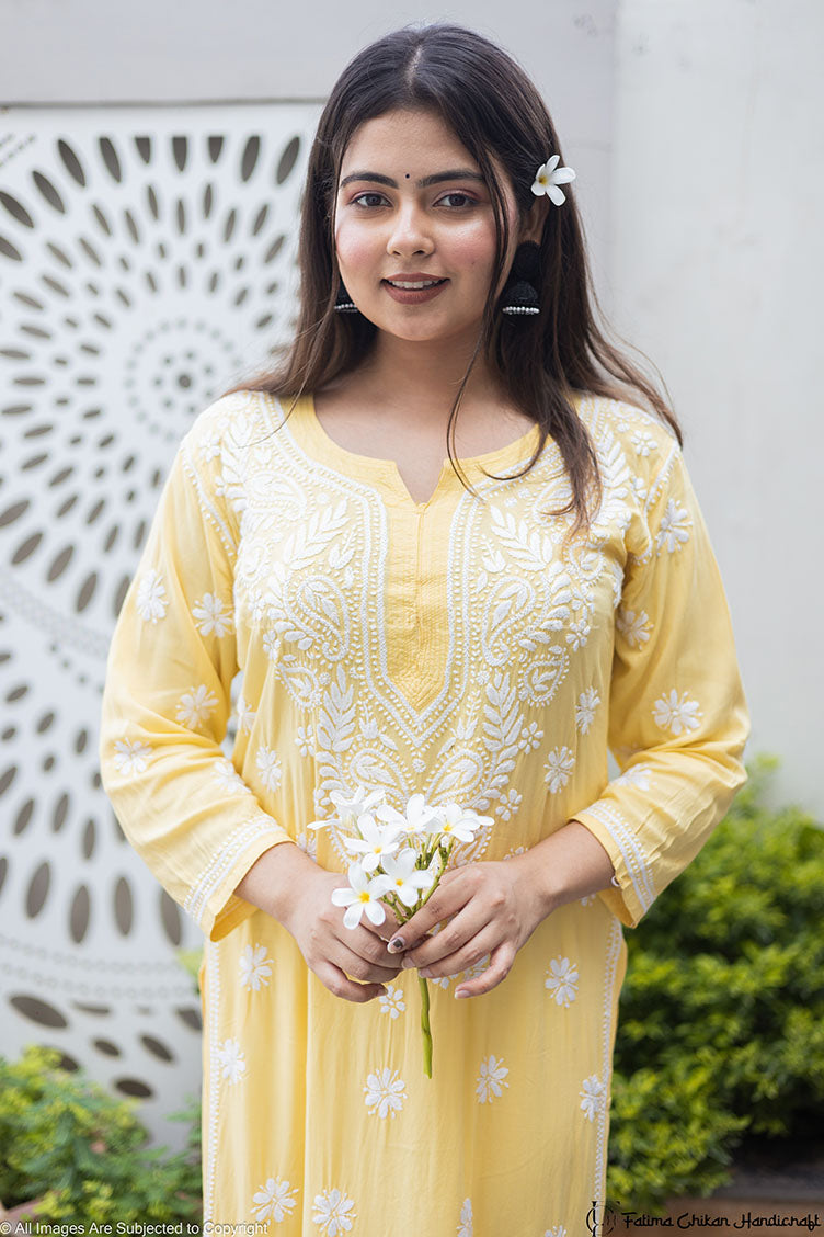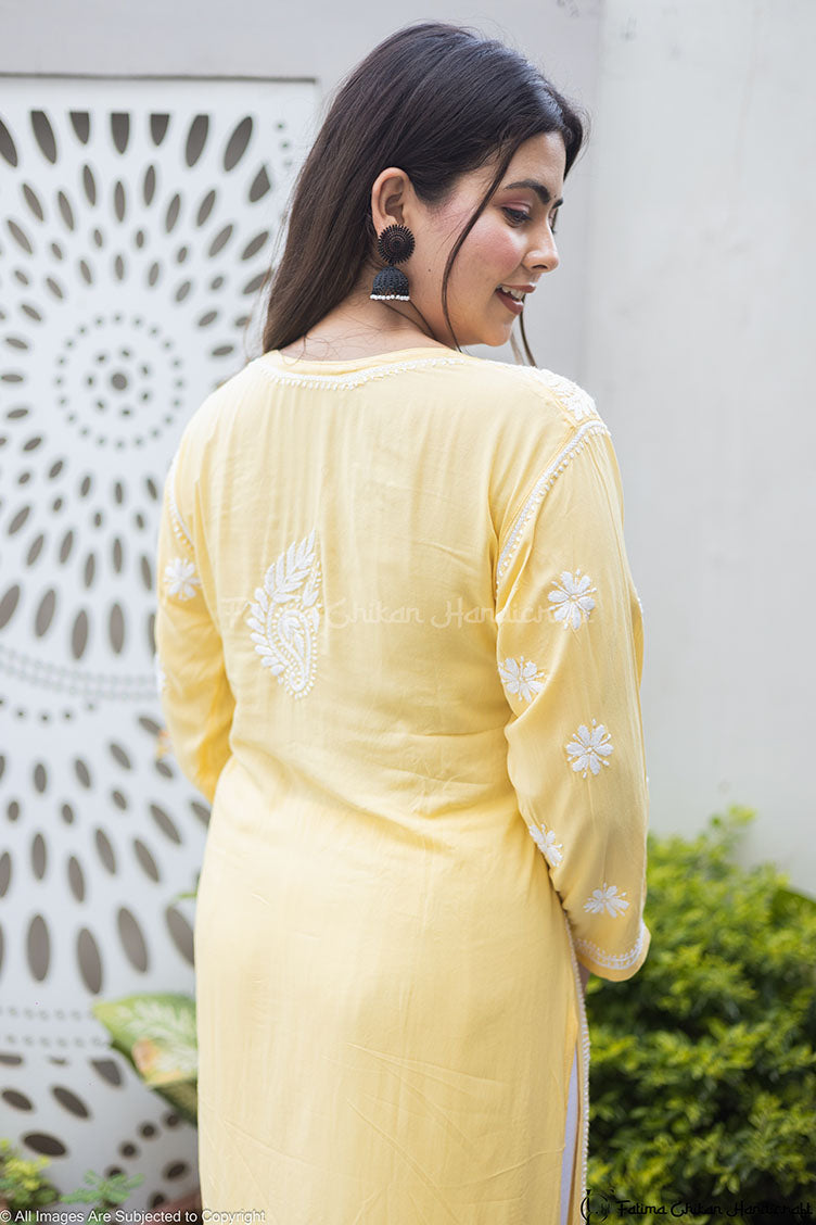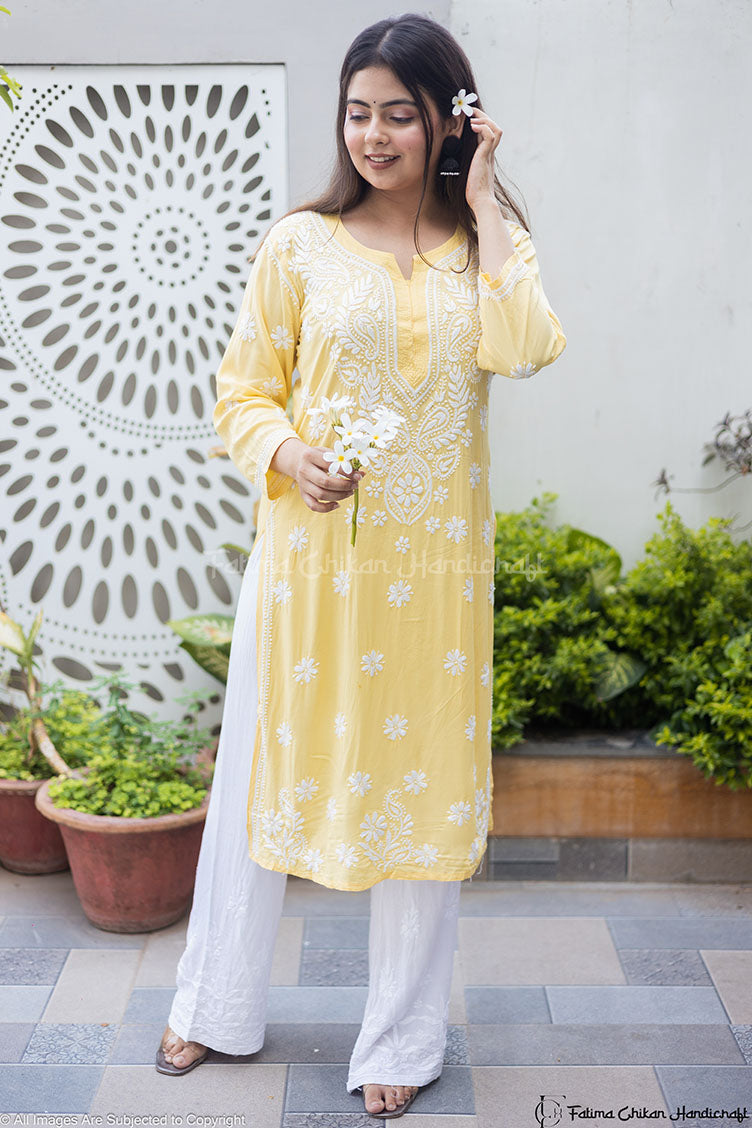 YELLOW MARIA MODAL STRAIGHT CHIKANKARI KURTI